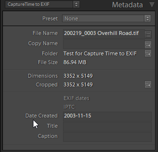 The plugin can use dates entered in Date Created and send them to the EXIF fields. This lets you apply individual dates to each photo. Q: Does Capture Time to Exif work in my version of Lightroom? A: It works on any classic Lightroom version later than Lightroom 3.0 including 3, 4, 5, 6, 2015, 7, 8 and Classic. However, it doesn't work on the cloud-dependent program that Adobe call "Lightroom". Q: Does Capture Time to Exif work on Mac? A: Yes, Mac or PC. Q: Do I need to install Exiftool? A: Not normally on PC, but I sometimes recommend that Mac Catalina and Big Sur users do so because recent changes to Mac operating system permissions can block this plugin's built-in Exiftool component. Q: Why isn't Capture time to Exif updating the EXIF? A: After running the plugin, you need to use Metadata > Read Metadata from Files. This gets the new EXIF data from the files. Q: Why would I enable the Date Created box? A: When I first developed the plugin, the idea was that someone could select x photos, enter a date for all of them, and apply it. Q: What's the “incremental time stamp” for? A: This adds a second or other interval to each image in the batch. Q: What if I want to change the camera model or other EXIF, but don't want to change the dates? A: Choose "Don't change date/time" from the EXIF dates drop down box. |