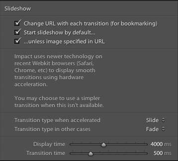 A preview of the gallery will be created using the photos in the film strip. Setting the title and descriptionScroll down to the Site Info panel to set the title for your page.This step is important since it defines the page title that'll be shown in the browser's title bar and the title and description that will be indexed by search engines. XML Auto IndexThe XML Auto Index fields offer Impact users the ability to integrate their page into a web site create using The Turning Gate's TTG XML Auto Index and TTG Pages galleries. Changing the look and feelThis is where you need to experiment. Work your way down the right hand panels and change the various options to see what effect they have on the page layout. Image scaling optionsBy default images are expanded to fill the window without being cropped (so there will be either horizontal or vertical “letter-boxing” around each image. This behavour requires Javascript to be enabled on the user's browser. See demo If Javascript isn't enabled, or if you prefer to allow your images to be cropped in order to display them at a more impressive size, then you may choose to scale your images in a number of ways: