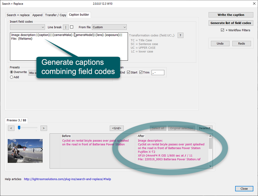 Search Replace Transfer is a Lightroom (version 4 or greater) plug-in designed for bulk changes to text in Metadata Panel fields. There are three key features