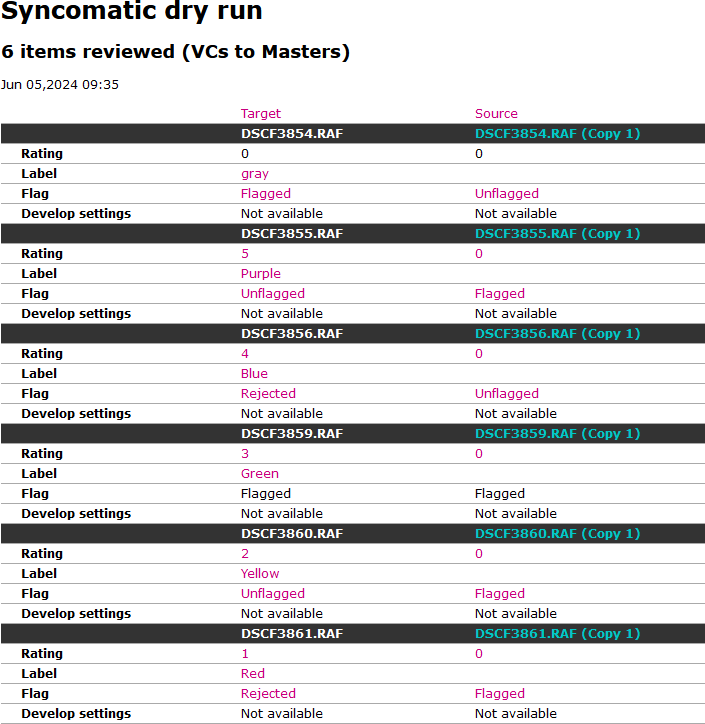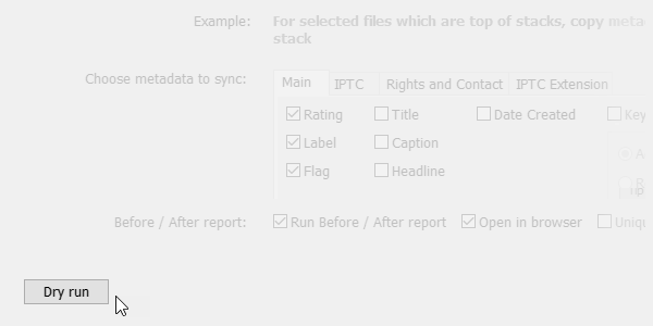This option (from version 5) runs all Syncomatic's processing and uses the options chosen in the dialog box, but it does not apply any changes to the target files. Instead it outputs to your web browser a modified version of the before/after report which allows you to see which images the plugin has matched, and review which fields will be changed when you run the plugin for real. While it shows all affected IPTC fields, it doesn't display Develop adjustment values (though that is a possible future update).