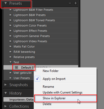 - Right click with the mouse on the "Develop preset" and select "Show in Explorer" or "Show in Finder"