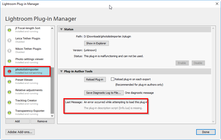 When clicking the "Add" button, navigate to the second, deepest folder with the name ending on "xxxx.lrplugin", in this case "photolistimporter.lrplugin"