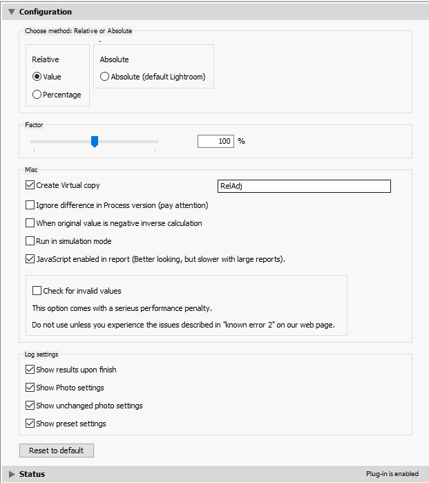 Default all photos settings are written to the log file. Unchecking this option will hide all photo settings that have not been changed by the plug-in, which makes the log compacter.