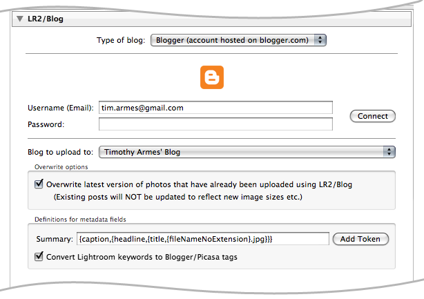 Blogger![]() To post to a Blogger blog you need to log on using your username (Email) and password. You'll then be able to choose which blog you're posting too. Images uploaded to Blogger are actually stored in a special album in Picasa Web. The album is created the first time you upload an image via the Blogger.com interface. If you've never done this then LR/Blog won't be able to find the album and it will ask you to upload an image via Blogger.com and then try again. You can define the image's Summary field using tokens. You may also choose to convert the keywords that are associated with the image into Picasa style tags. Overwriting imagesYou can use the plugin to overwrite the previous version of an uploaded image. This can be very useful if you make a change and wish to update your blog. PostingYou can create a post directly from within LR/Blog. This allows you to prepare the blog entry by inserting all of the exported images into the post. You can then refine the post online once the export has finished. ![]() TemplatesThe HTML code used to embed the images is defined by one or more templates. These templates are added to the post's contents; the first template is used for the first photo, the second for the second photo, and so on. Once the last template has been used the cycle starts again with the first template. Most of the time a single template is sufficient, in which case it is used for each of the photos exported. However multiple templates allow you to far more flexibilty if you wish to have more control over your layout. For example, you may use multiple templates to correctly format the output when you're exporting exactly 3 photos that you wish to be placed in a particular way; you would then save this as a preset and use it when appropriate. The pull down preset menu above the template text allows you to save different templates and recall them quickly. TokensThe templates that you create wouldn't be useful if they could display your images, IPTC or EXIF metadata or other image specifiy information. For this reason you will use tokens that are replaced by LR/Blog as the images are exported. The token system will be very familiar to anyone using LR2/Mogrify to annotate their images or LR/Transporter for exporting metadata from Lightroom. The {img} token will probably me the most useful - it's replaced by the HTML necessary to display your photo in the blog post. Displaying smaller versions of an imageAlthough the plugin only uploads the image at the size which you have specified, Blogger itself allows you to generate different sized versions of an image in order to display them in a post. For this you need to use a special URL to access the image. You can generate this URL by using the {url} token with a size parameter. For example, {url[512]} will fetch the image at 512 pixels. The pixel sizes that Blogger supports are 200, 288, 320, 400, 512, 576, 640, 720, 800, 912, 1024, 1152, 1280, 1440 and 1600. LR/Blog will always use the nearest available size. For example, {url[250]} will be converted to {url[288]}. |