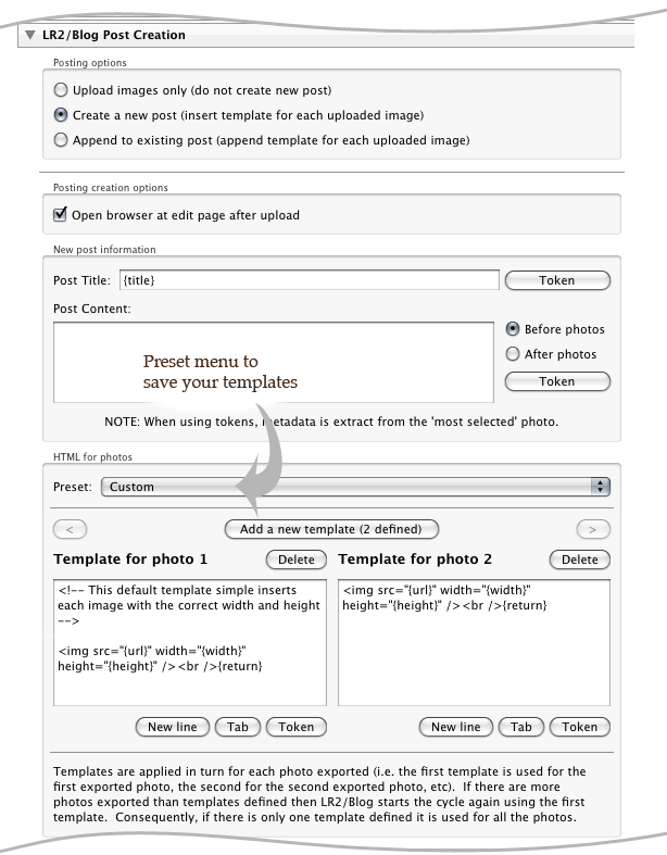 MetaWeblog compatible sites![]() There are many other blogs that understand the MetaWeblog protocol, and you should also be able to upload to these using LR/Blog. Consult your blog's documentation to find the corrent URL for the XML-RPC service. PostingYou can create a post directly from within LR/Blog. This allows you to prepare the blog entry by inserting all of the exported images into the post. You can then refine the post online once the export has finished. ![]() TemplatesThe HTML code used to embed the images is defined by one or more templates. These templates are added to the post's contents; the first template is used for the first photo, the second for the second photo, and so on. Once the last template has been used the cycle starts again with the first template. Most of the time a single template is sufficient, in which case it is used for each of the photos exported. However multiple templates allow you to far more flexibilty if you wish to have more control over your layout. For example, you may use multiple templates to correctly format the output when you're exporting exactly 3 photos that you wish to be placed in a particular way; you would then save this as a preset and use it when appropriate. The pull down preset menu above the template text allows you to save different templates and recall them quickly. TokensThe templates that you create wouldn't be useful if they could display your images, IPTC or EXIF metadata or other image specifiy information. For this reason you will use tokens that are replaced by LR/Blog as the images are exported. The token system will be very familiar to anyone using LR2/Mogrify to annotate their images or LR/Transporter for exporting metadata from Lightroom. The {img} token will probably me the most useful - it's replaced by the HTML necessary to display your photo in the blog post. |