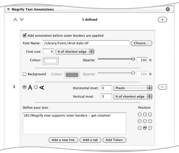 LR/Mogrify 2 also allows you to add multiple text annotations to your images. The text may be broken up onto several lines, and may include references