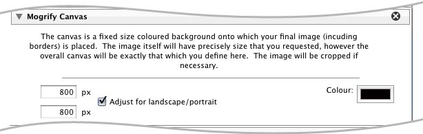 options available, and borders are added. The images is then places on the fixed size canvas, which may have any colour you choose.