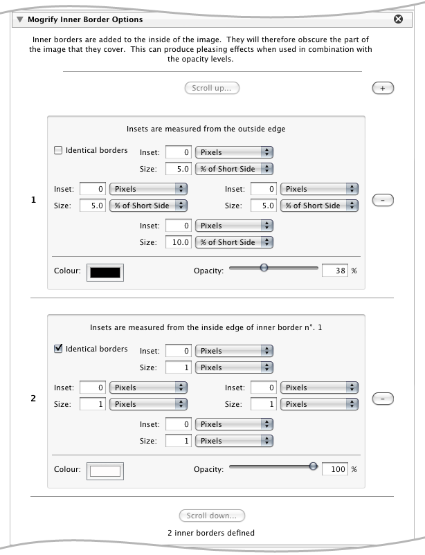 You can add any number of borders to an image, and each border can be independently defined in pixels or as a percentage