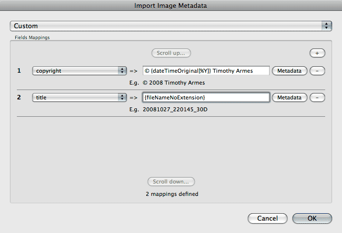 Changing metadataUnder Lightroom 2 and above LR/Transporter allows you to modify the metadata of certain fields based on other fields. To access this feature you should first select the images to act upon and then choose Library->Plugin Extras->Change Metadata using LR/Transporter. You should select the fields to change on the left hand side and define the new contents (which may refer to other metadata fields via the use of Metadata Tokens). The resulting replacement text is shown underneath the replacement's definition; the result is only shown for the primary ("most-selected") image in the current selection. New fields can be added using the "+" button. ![]() Example usesThere are many potential uses for this. For example, you may like to update the IPTC title field to be the same as the filename (without extension). Another use may be to update incorrect copyright statements to reflect the correct year, using something such as: |