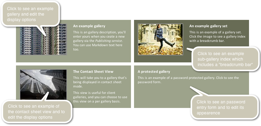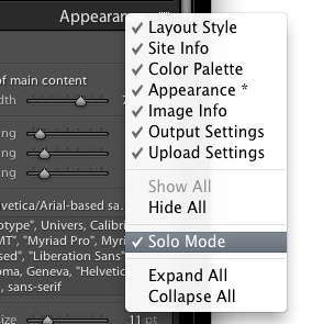 Look and feelWhen the plugin is installed it will also install some example templates that will allow you to get feel for the type of designs that are possible. You'll find these template listed on the left hand side. Here's an example (the list will vary from what you see here): ![]() Click on the different examples to see the different designs. Note the "do not modify" comment. Beware that the plugin will delete this folder and install a more recent copy whenever it's updated, so any changes that you make here will be lost. If you wish to use a template then you should take a copy and place it in another folder. Once you've explored these examples you can take control of your own own design using the options on the right hand side — most of these options will be found in the Appearence panel. The options available will vary from plugin to plugin based on the design, and it's best to experiment — you can't break anything! Note that in order to reduce the number of options that are visible at any one time in the right hand column the plugin hides the options for various page types (gallery page, index page, contact page...) until they're actually displayed in the preview window. To reduce the clutter even further, we recommend that you use "Solo mode": right click on a Panel title and choose "Solo mode" - Lightroom will only open one panel at a time, and this greatly simplifies the task. ![]() Page content and MarkdownMost pages on your site will include textual content. The Web Site Publisher Pro galleries are the first Lightroom galleries (and at the time of writing the only ones) to give you unprecedented control over your text by allowing you to use the Markdown format developped by John Gruber. By correctly formatting your text you can trivially add headings, paragraphs, links, images, lists, bold and italic text, etc. Advanced users may even insert snippets of HTML. Visit John's guide for some basic examples. Double clicking on the text on any page in the web module will allow you to see and modify the underlying Markdown text. If this doesn't work (it fails under some Windows configurations) then you can still modify the text from the right hand side — you'll find the text for each page under the Site info panel. IMPORTANT: To add newlines you'll need to type <option>-<return> on Mac or <ctrl>-<return> on Windows. Adding menu items and pagesThe menu items that appear in the navigation bar are defined in the "Appearence" panel. There are six available and for each one you may define its title, specify the destination page and choose whether or not to include it in the navigation bar ![]() The destination page may be one of the gallery's own pages such (e.g. the Contact page), or you may enter a link to an external site — this may be useful if you have a blog hosted elsewhere, for example. The built-in pages include the Home page (the first page that the user sees), the Contact page, the Gallery Index page and three miscellaneous pages that you can use for any purpose (for example, you could add an "About" page or a "Link" page). The Contact pageThe Contact page gives you the option of creating a form for your visitors to fill in. For this to work a small program will need to be run on the server that takes the contents of the form and sends it to you by email. To this end, the plugin will by default generate this page in a special prgramming language called PHP that'll be run by your web host's server. There are however two caveats: